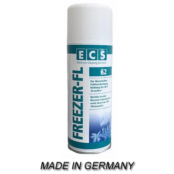 فريزر اسبراي (صنع في ألمانيا) يضمن تبريدًا سريعا يصل إلى 50- درجة مئوية تحت الصفر. بسرعة هائلة يحدد موقع المكونات الحرارية المتقطعة بسبب الحرارة المستحثة العالية. المنتج نقي كيميائيا جدا ، لا يضر أي مادة هندسية شائعة الاستخدام ويتبخر على الفور دون أي بقايا تم اختبار افريزر اسبراي لتحقيق درجات الحرارة المنخفضة للأنظمة الإلكترونية والحساسة للحرارة الزائدة مثل الايس سي ، الترانزستورات ، الثنائيات ، المقاومات ،وجميع المكونات الالكترونية الاخرى - وايضا مناسب لحماية المبرد الحراري للمكونات الإلكترونية أثناء لحام أو فك اللحام